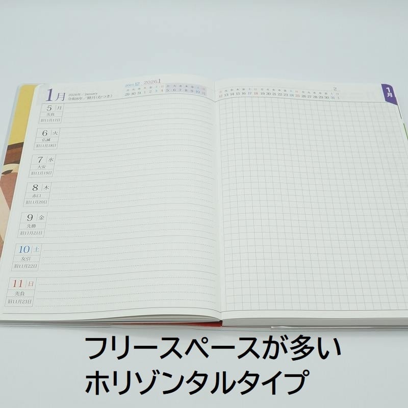 ホリゾンタルタイプは見開き1週間で、一日の枠が大きいので、一言日記帳としても楽しめます。