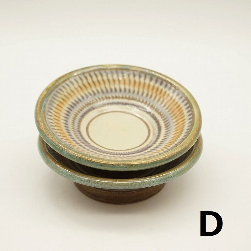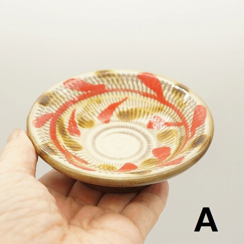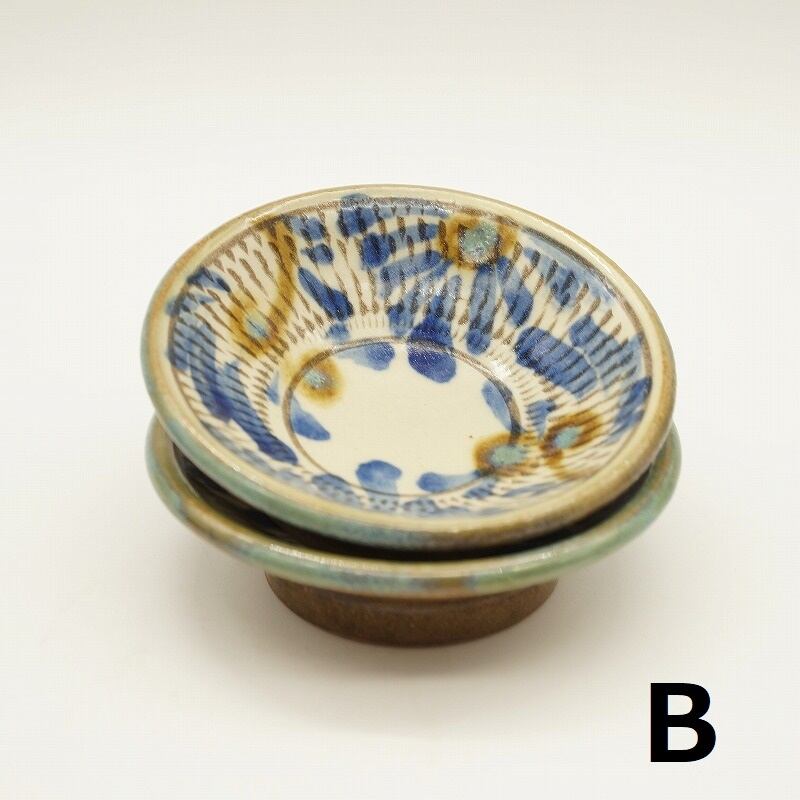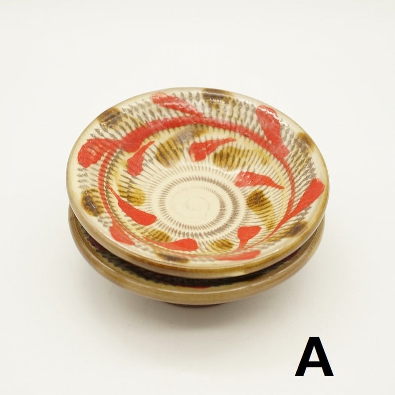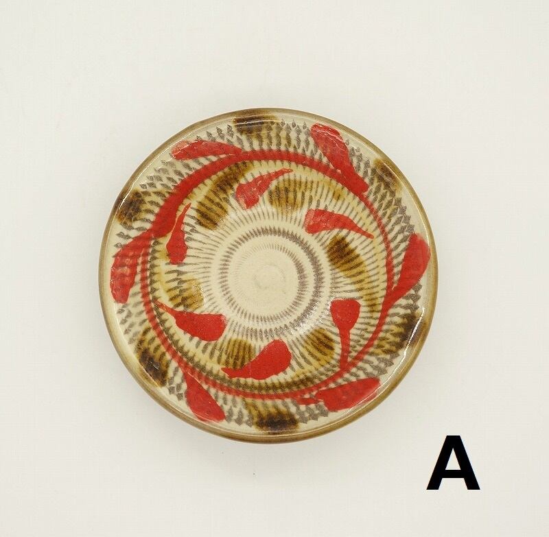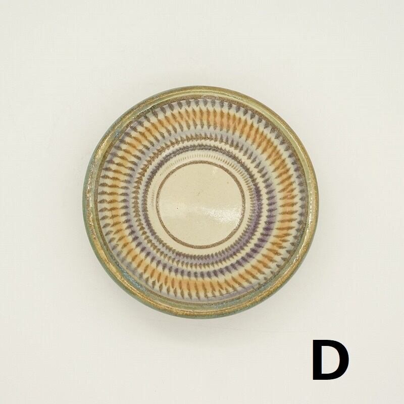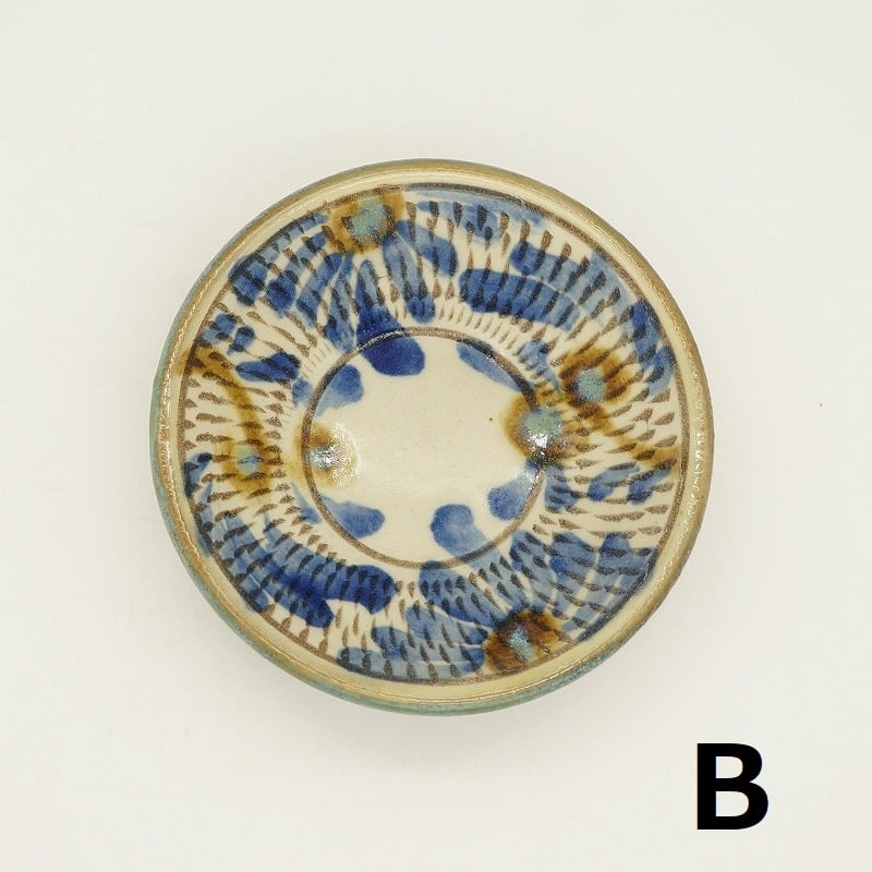 とびカンナに唐草模様など、やちむんの伝統的な模様や技法で仕上げた、何枚あっても嬉使い勝手の良いの3寸皿。