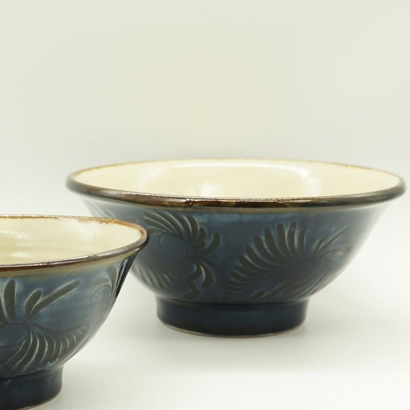 南城市に工房を構える【石倉陶器所】の6.5寸マカイ 藍彩線彫り