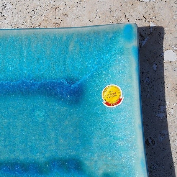 「コマカアイランドブルー」という釉薬を使用した長角皿は、2018南城セレクションに選定されたもの。